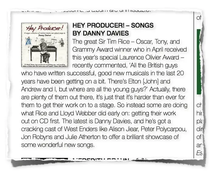 Hey Producer!, Danny's latest offering, is a collection of songs from past productions, more recent projects and songs written specifically for the album. With the kind support of numerous musical theatre stars from London's West End, this album features voices from some of the World's favourite musicals, including Les Miserables, Ghost, Phantom of the Opera, Betty Blue Eyes, Avenue Q, Chess, Wicked, Priscilla Queen of the Desert, Road Show, Chicago, Sister Act, Tommy, Blood Brothers and many more. From dramatic theatrical ballads to intimate cabaret performances, this album is an emotional roller coaster that demonstrates Danny's wide range of composition and lyrical style. In the words of Dame Judi Dench, "I think Danny has produced something new and exciting. Have a listen and I'm sure you will agree."